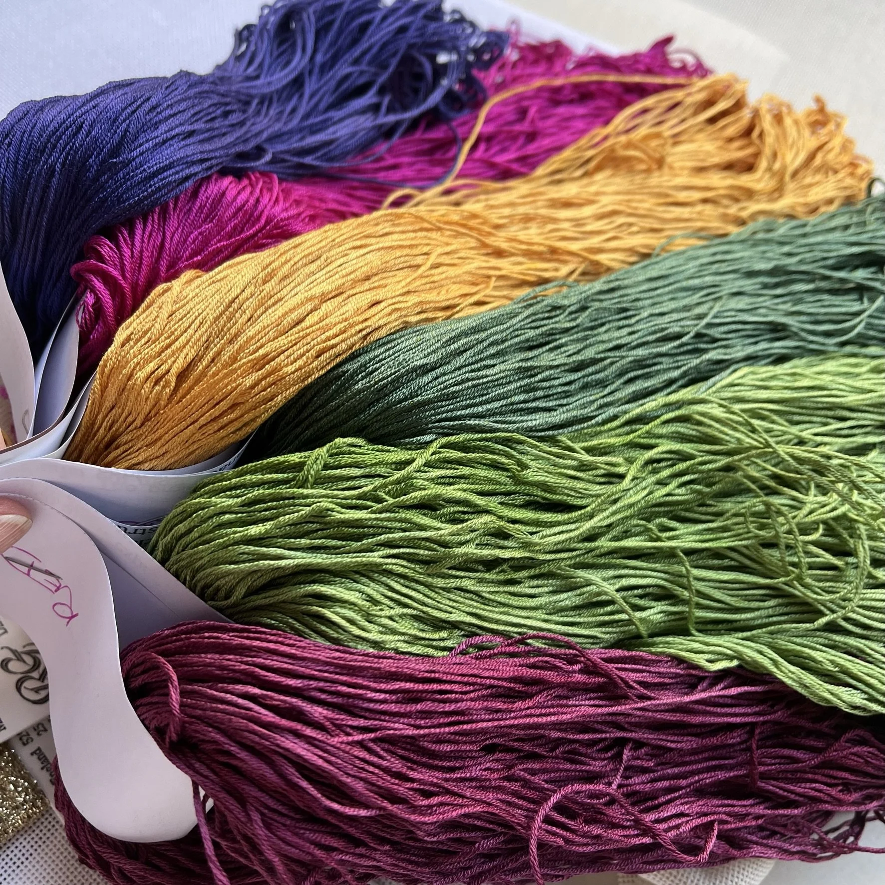 Her phrase described beautifully how hand work takes you to a place of engagement and fulfilment that is hard to replicate when you live life purely through a consumer or achiever lens. It's one of the reasons I love to hand-dye threads for my students and customers so much. It takes a ridiculous amount of time and energy for my assistant and I to wrap the skeins, dye them, label them and then package them up to destinations around the world. There are plenty of thread producers from whom I could source commercially dyed thread, thus making my life a whole lot easier. But I wouldn't then have the fun of standing in my laundry, painting a skein the most delicious shade of purple, and knowing that somewhere in the world, in the next few months, someone will take my love of colour and combine it with their love of stitching to create something special and unique. The depth of work I get to share with that unknown stitcher creates a small but real connection between us.