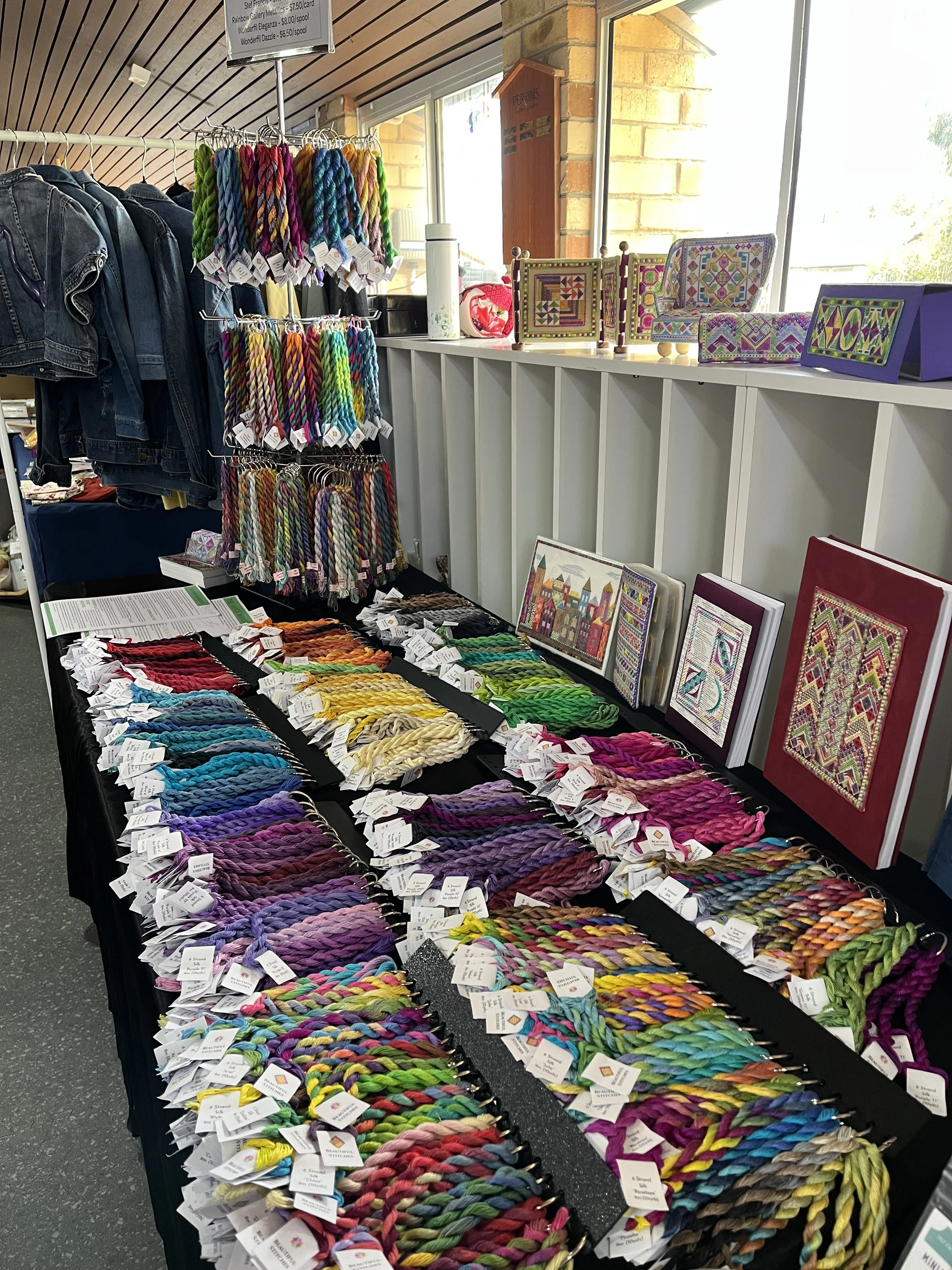 An array of my threads ready for visual and tactile exploration at Fibres West, October 2025